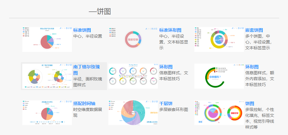 饼图(环形图)、雷达图、地图、和弦图、力导布局图、仪表盘、漏斗图。