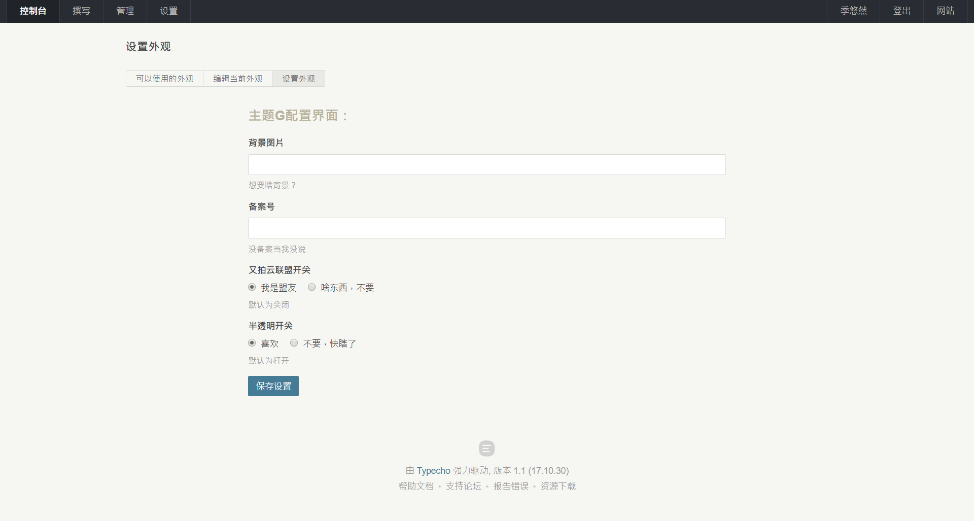 以上为主题G的基本用法。说起来这个主题的自定义程度并不高,但是由于作者代码水平低下所以源码应该不是很难看懂,欢迎二次开发。不过请保留原作者信息哦!