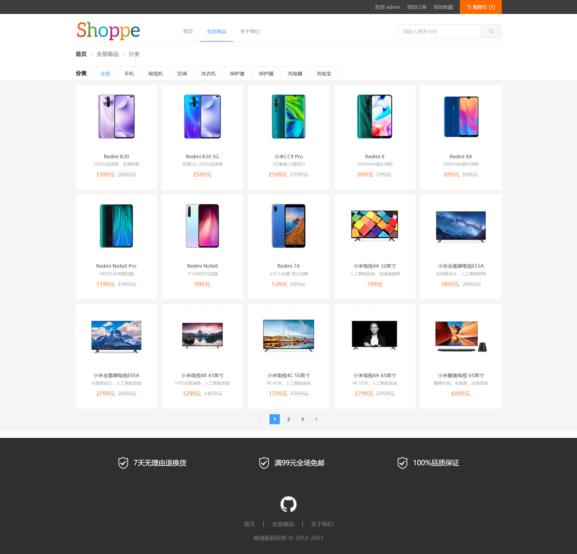 全部商品页面集成了全部商品展示、商品分类查询,以及根据关键字搜索商品结果展示。