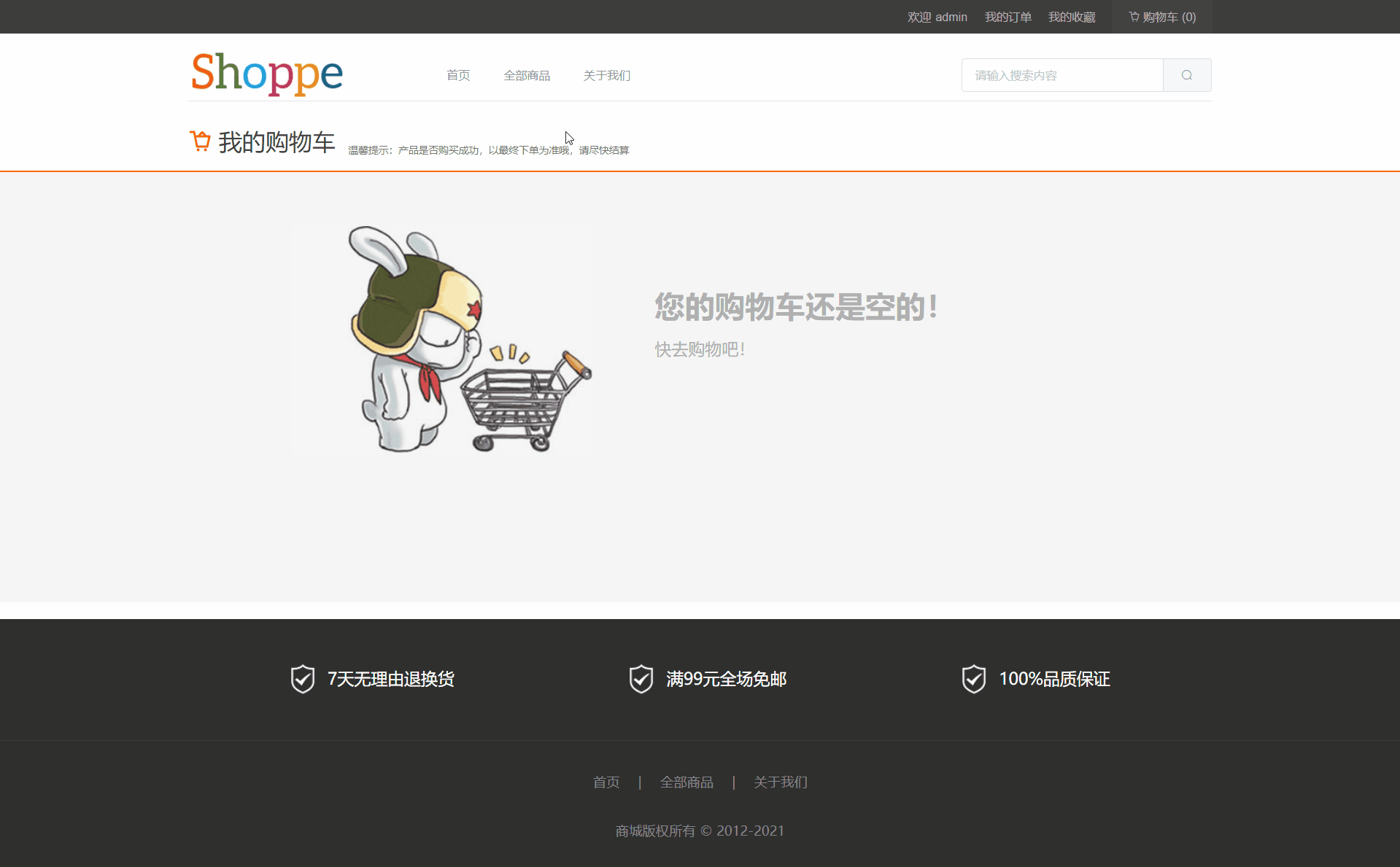 前端包含了11个页面:首页、登录、注册、全部商品、商品详情页、关于我们、我的收藏、购物车、订单结算页面、我的订单以及错误处理页面。