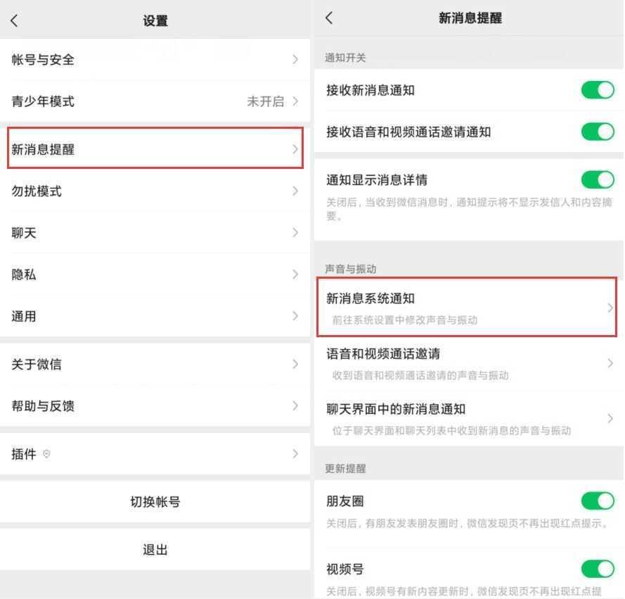 然后打开-gt;微信设置-gt;点击「新消息提醒」-gt;再找到「新消息系统通知」
