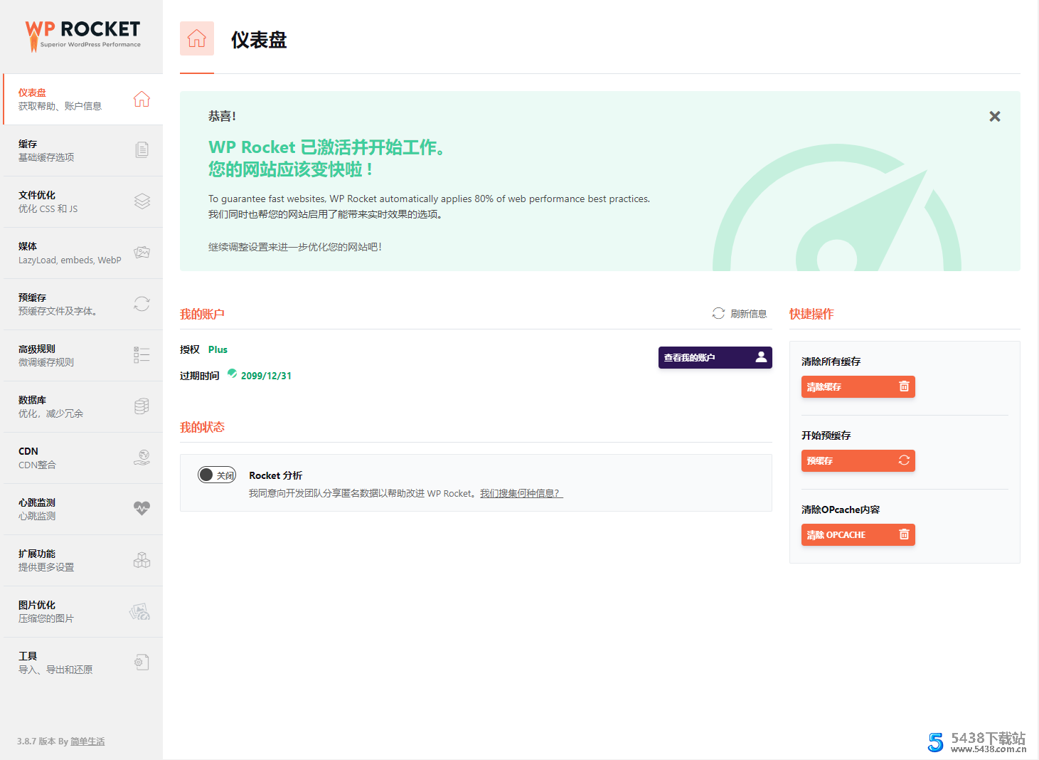 WP Rocket,知名的收费WordPress缓存插件,WP静态缓存优化插件,主要用于页面缓存、静态文件优化,缓存预加载、调整缓存规则等。