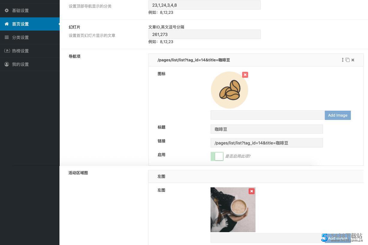 1.8、首页导航菜单按钮增加删除修改开启设置;