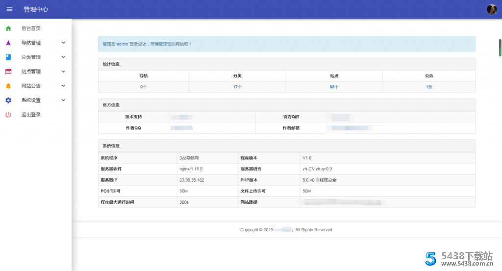 后台功能: 1.支持修改所有网站信息 2.支持修改管理员信息 3.支持上传网站logo/favicon图标/微信二维码 等图片 4.支持添加/修改/删除导航 5.支持添加/修改/删除分类 6.支持添加/修改/删除站点 7.支持审核/删除站点申请 8.支持发布/修改/删除公告