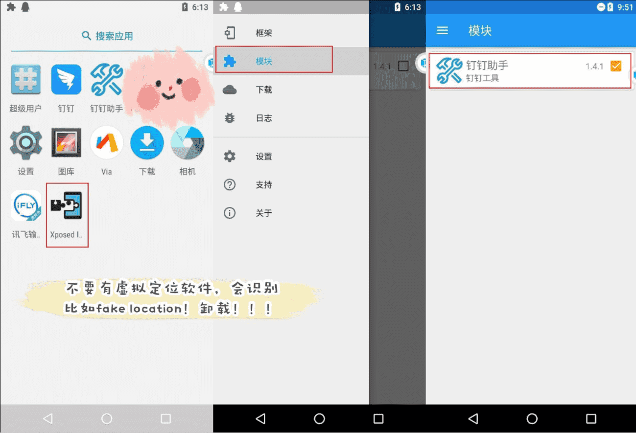 点击xposed,左上角三条杠,模块,勾选钉钉助手,重启虚拟机。