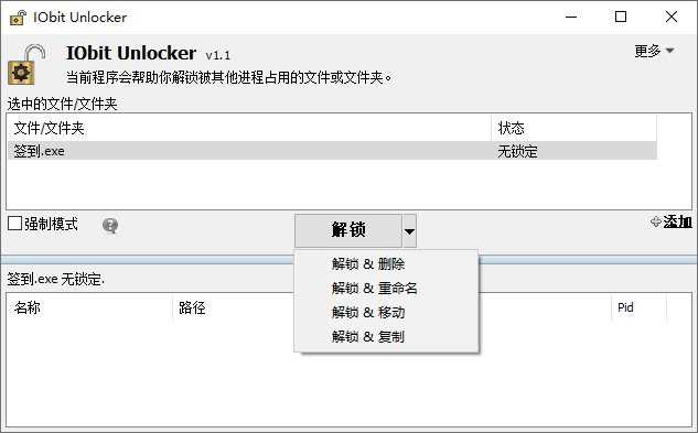 IObit Unlocker,解除文件锁定工具,文件强制删除工具,支持Windows所有版本,可以方便的通过资源管理器右键解除被锁定占用的文件,从而轻松删除被锁定的文件或文件夹。