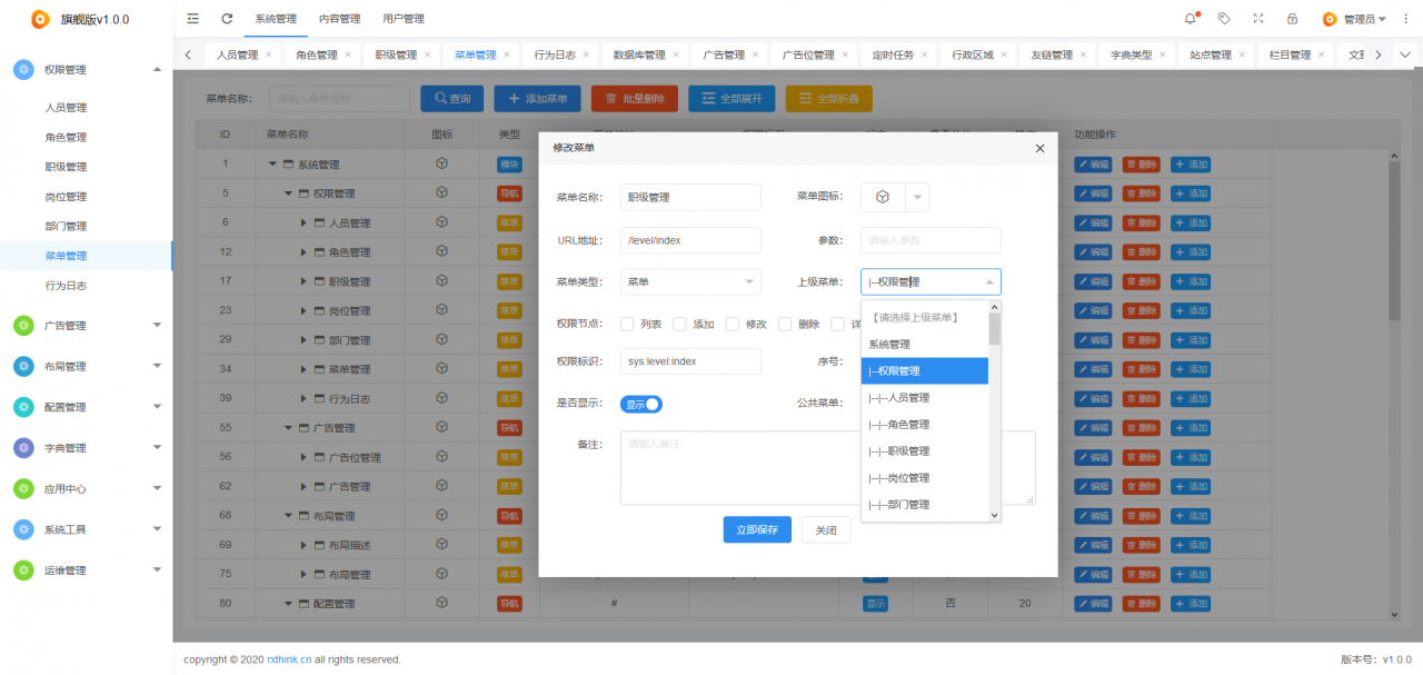 2、【优化】优化菜单管理模块,新增权限节点:批量删除、添加子级、全部展开、全部折叠等等;